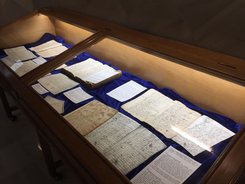 Diversas palias o hijuelas, pertenecientes a la Fundación, se pueden observar entre los documentos expuestos en las vitrinas. |