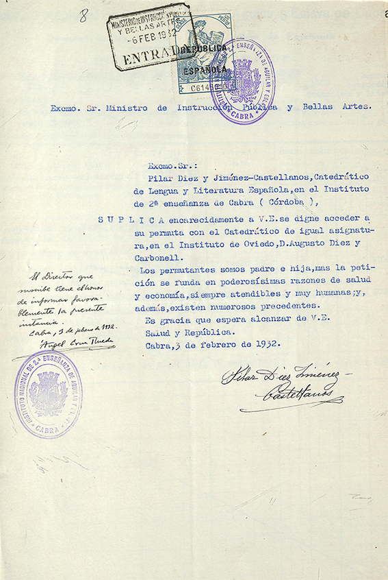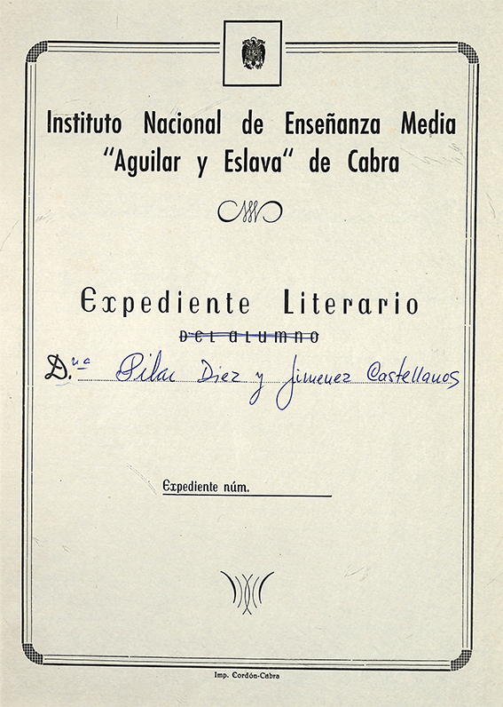 Conforme al expediente académico, Pilar Díez inició su actividad profesional como catedrática en el Instituto de Cabra. Se incorpora al mismo, según la Hoja de Servicios, el 20 de abril de 1928 y cesa el 15 de julio de 1932 por traslado al Instituto de Oviedo. Su llegada se recoge en el acta del Centro de fecha 17 de octubre de 1928: “3.º.- El Director comunica al Claustro que la profesora de Literatura, Doña Pilar Díez y Jiménez-Castellanos, de cuyo nombramiento dio cuenta oportunamente, se hizo cargo de su cátedra el día dos del corriente mes. Aunque ausente, quiere darle la bienvenida en esta sesión, que es la primera que se celebra después de su llegada a Cabra. El Claustro hace suyas las palabras que el Director pronuncia en elogio de la nueva compañera y acuerda que conste en acta el saludo que por unanimidad se le dirige”.