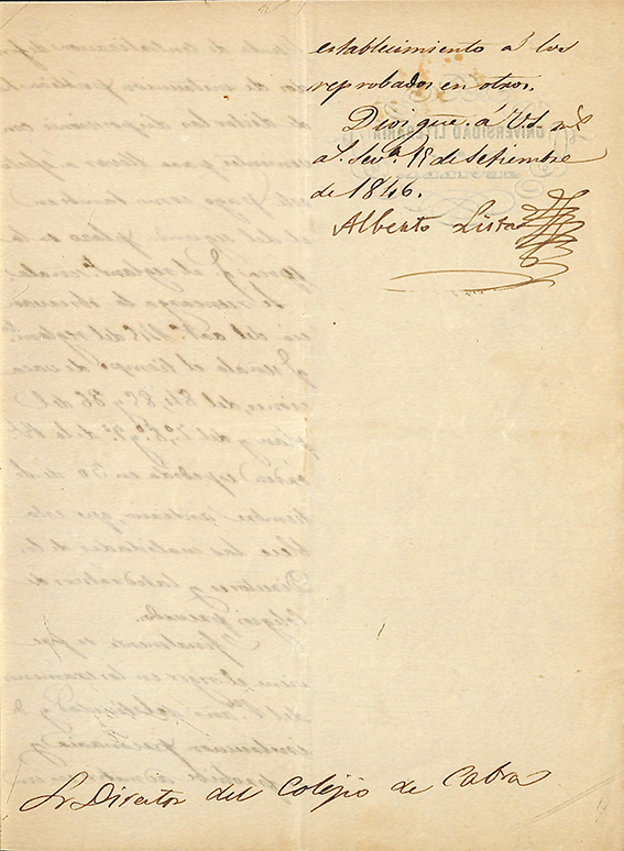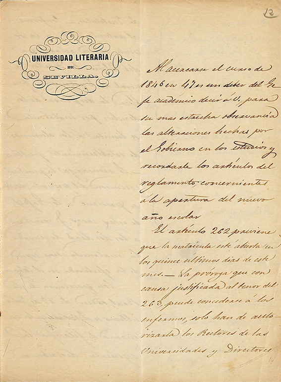 “Al acercarse el curso de 1846 en 47 es un deber del Jefe académico decir a V. para su más estrecha observancia las alteraciones hechas por el Gobierno en los estudios y recordarle los artículos del reglamento, concernientes a la apertura del nuevo año escolar.