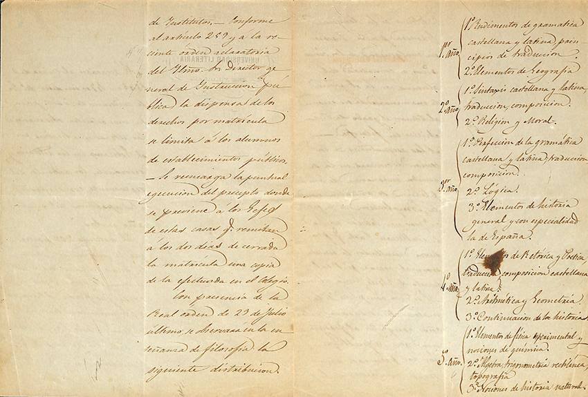 Los que se matriculen en 5.º año de Filosofía, en vez de asistir al segundo curso de Matemáticas elementales, cuyas materias estudiaron en el precedente concurrirán a la cátedra de latín, retórica y poética.