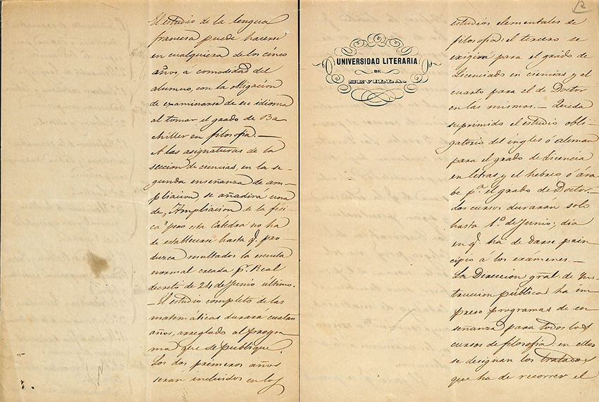 A continuación, copiamos literalmente todo el texto de esta primera entrega, alusivo a los asuntos a tener en cuenta ante el inicio del nuevo curso escolar, matrícula, enseñanza a impartir, la distribución de la filosofía, lengua francesa, sección de ciencias, matemáticas, observancia de diversos artículos, etc.; con membrete de la Universidad Literaria de Sevilla. Dice así: