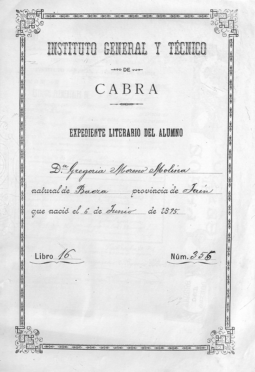 La reseña en la Memoria del Instituto del curso 1909-1910: “[…] mereciendo el premio extraordinario en el Ingreso, la Srta. Gregoria Moreno Molina, a la que felicito cordialmente”, nos ha llevado a tener acceso a su expediente académico y descubrir algunos de los aspectos educativos de la alumna. En aquellos momentos los estudios que se llevaban a cabo en el Instituto eran “generales del Bachillerato y de Magisterio Elemental de 1.ª enseñanza”.