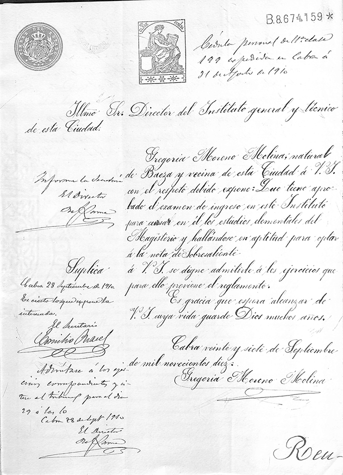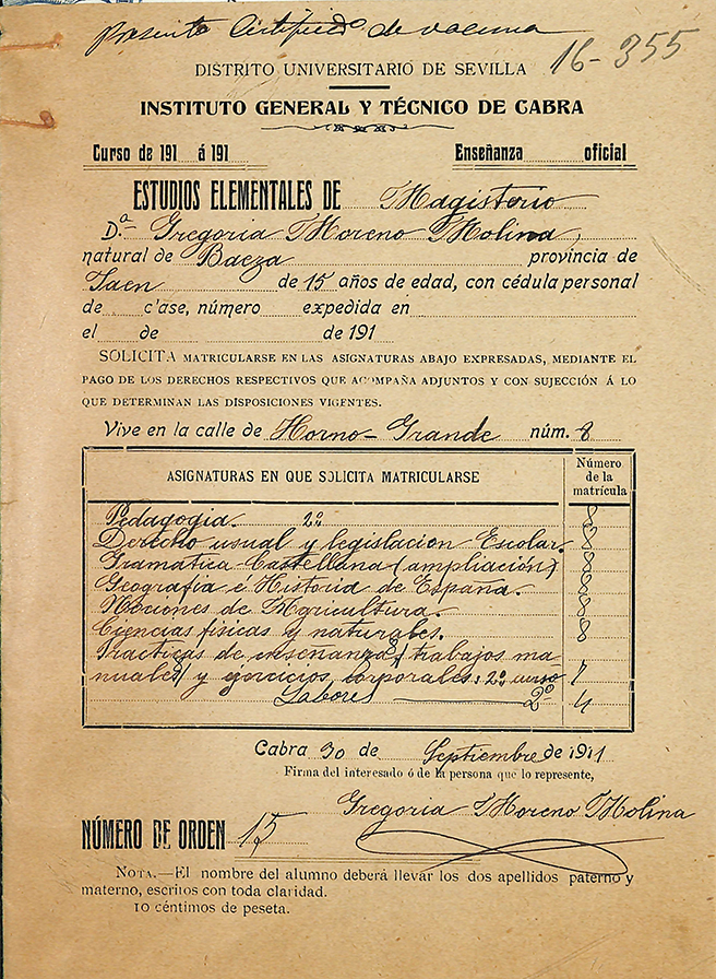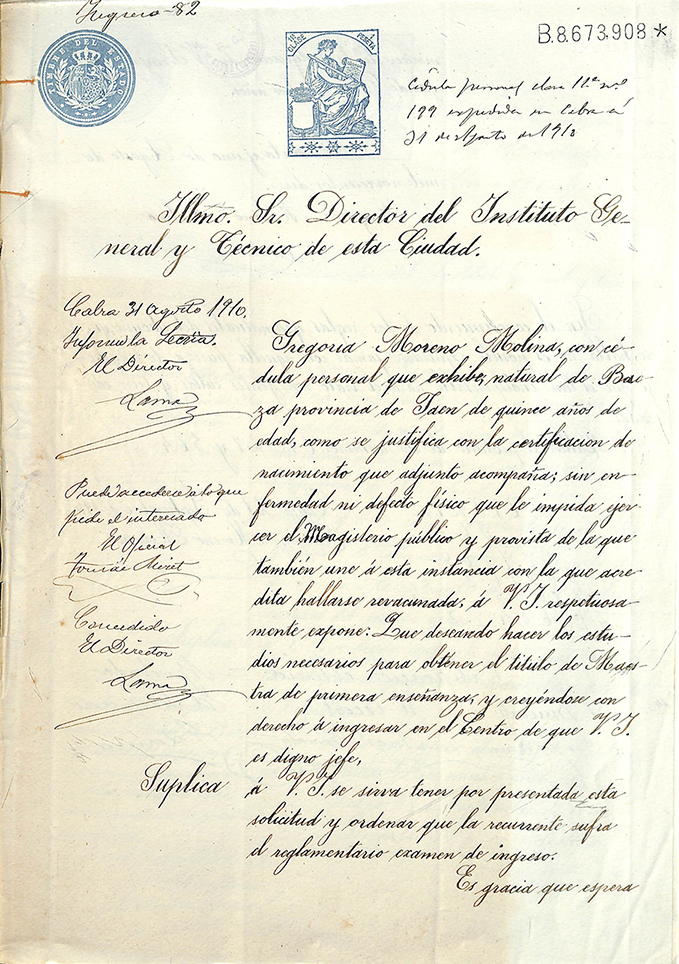 Gregoria Moreno Molina, con cédula personal que exhibe, natural de Baeza, provincia de Jaén, de quince años de edad, como se justifica con la certificación de nacimiento que adjunto acompaño; sin enfermedad ni defecto físico que le impida ejercer el Magisterio público y provista de la que también une a esta instancia con la que acredita hallarse revacunada, a V. I. respetuosamente expone: Que deseando hacer los estudios necesarios para obtener el título de Maestra de primera enseñanza, y creyéndose con derecho a ingresar en el Centro de que V. I. es digno jefe,