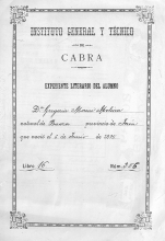 Gregoria Moreno Medina, natural de Baeza provincia de Jaén y vecina de esta Ciudad de 15 años de edad a V. I. con la consideración debida expone: Que ha obtenido la calificación de Sobresaliente en el examen de ingreso y como según el artículo 18 del Reglamento de exámenes vigente esta nota le da derecho a la matrícula de Honor en las asignaturas del primer grupo.