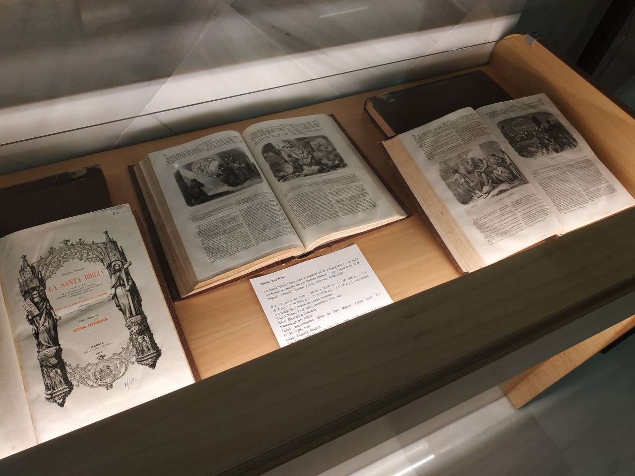 En la otra vitrina se exhibe la conocida BIBLIA DE SCÍO. Se trata de la Biblia Vulgata latina traducida en español y anotada conforme al sentido de los Santos Padres y expositores católicos; una versión de la Biblia elaborada por el sacerdote escolapio español Felipe Scío de San Miguel (1738;1796). Nuestra edición, ilustrada, está impresa en Madrid por los editores Gaspar y Roig en los años 1852 y 1854.
