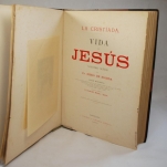 En una de las dos vitrinas, exponemos una edición monumental de LA CRISTIADA, vida de Jesucristo, de Fray Diego de Hojeda. Extraordinaria encuadernación, con tapas de cartón forradas en piel, con dorados y clavos, y dejándose ver la técnica de gofrado. Todo un lujo en grandes dimensiones (44,00 x 33,00 cm) y un peso aproximado de 11 kilos. Los editores de la magna publicación, L. González y Compañía (Barcelona, 1896) dedican su joya bibliográfica a S.S. León XIII.