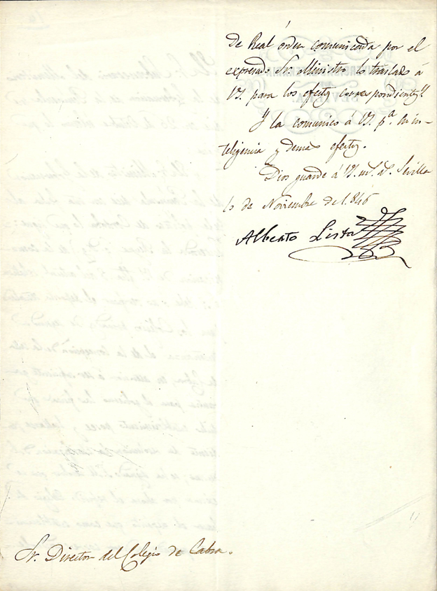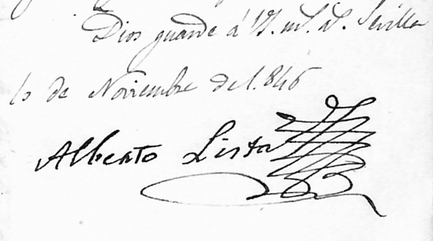 Dios guarde a Vd. muchos años. Sevilla 10 de noviembre de 1846. Alberto Lista [firma autógrafa].