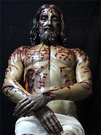 La lanzada se produjo tras la muerte y atravesó el cuerpo del Crucificado entre el quinto y el sexto espacio intercostal y hasta esta escultura del profesor Miñarro, no se había representado nunca la herida de la lanzada que salió por la espalda.
