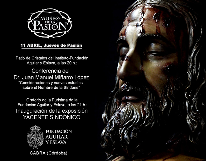 actualidad 03.04.19 Actos de presentación del Yacente sindónico del Museo de la Pasión La nueva obra del Yacente sindónico del Museo de la Pasión de Cabra será presentada el próximo día 11 de abril, Jueves de Pasión, en el Patio de Cristales del Instituto-Fundación Aguilar y Eslava de Cabra, a partir de las 20´00 h con una conferencia impartida por el doctor Juan Manuel Miñarro López, de la Universidad de Sevilla, titulada "Consideraciones y nuevos estudios sobre el Hombre de la Síndone". A continuación, a las 21´00 h. en el Oratorio de la Purísima de la Fundación Aguilar y Eslava, se inaugurará la exposición donde se podrá contemplar la referida obra.