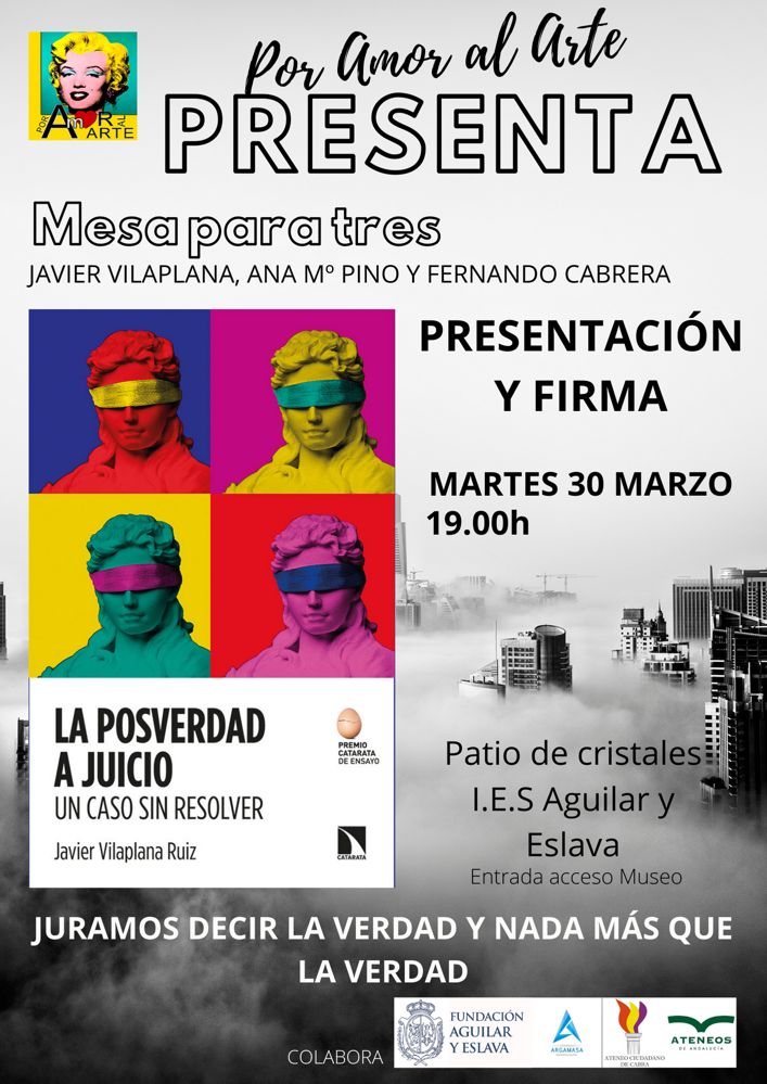actualidad 23.03.21 Presentación del libro de Javier Vilaplana "La posverdad a juicio. Un caso sin resolver" El próximo martes 30 de marzo, a las 19:00h tendrá lugar en la patio de cristales de nuestra Fundación-Instituto, la presentación del libro 'La posverdad a juicio. Un caso sin resolver' en un acto que organiza la librería Por Amor al Arte de nuestra ciudad, con la presencia de su autor Javier Vilaplana.