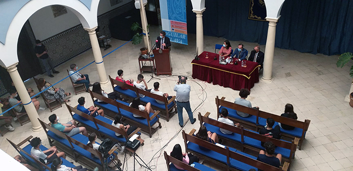 En segundo lugar intervino el Director del centro, D. Salvador Guzmán Moral, que destacó la importante tradición de inaugurar el curso con un acto de este tipo y las numerosas efemérides que tendrán lugar en el curso que ahora se inicia, que se celebrarán en cooperación con la Fundación Aguilar y Eslava, destacando el 175º aniversario de la conversión del antiguo Real Colegio de la Purísima Concepción en instituto público, allá por el año 1847.