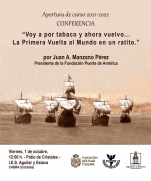 A continuación, tras ser presentado por el Director, intervino el Presidente de la Fundación Puerta de América, D. Juan Antonio Manzano Pérez, que impartió una instructiva conferencia sobre la Primera Vuelta al Mundo por parte de la Armada de la Especiería comandada por el marino portugués Hernando de Magallanes, que se inició un 20 de septiembre de 1519 y que finalizaría el 6 de septiembre de 1522, el español Juan Sebastián Elcano, teniendo como origen y llegada a la histórica ciudad de Sanlúcar de Barrameda (Cádiz).