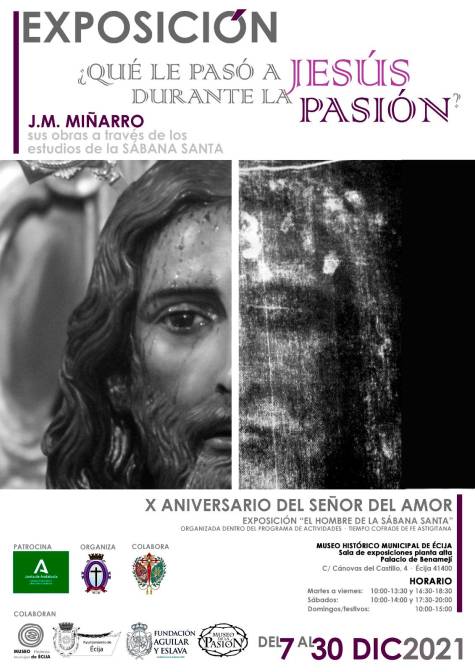 actualidad 30.11.21 Exposición en Écija: "¿Qué le pasó a Jesús durante la Pasión?/ El Hombre de la Sábana Santa" Écija acogerá la exposición sobre «El Hombre de la Sábana Santa» debido al X aniversario de la bendición de Ntro. Padre Jesús del Amor y dentro del programa de actividades “Tiempo Cofrade de Fe astigitana” del Consejo de Hermandades y Cofradías de Écija, con el patrocinio de la Junta de Andalucía, la Hermandad de Ntro. Padre Jesús del Amor en Su Prendimiento y María Santísima de la Concepción. Se podrá visitar en el Museo Histórico Municipal (Palacio de Benamejí), del 7 al 30 de diciembre.