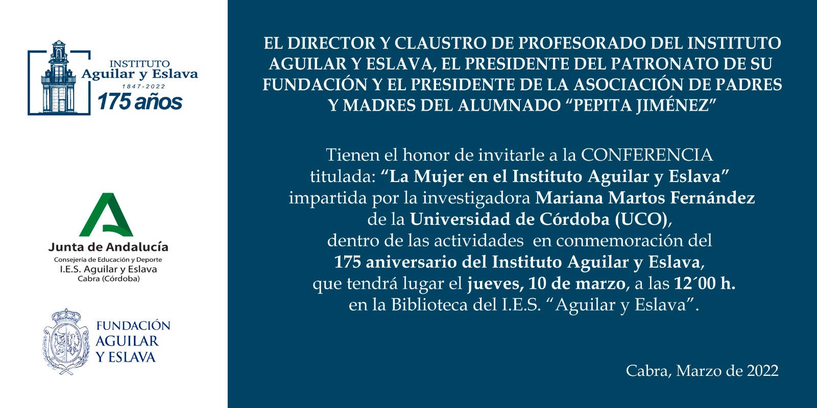 Con tal motivo y gracias a una especial atención a la presencia de las mujeres en el alumnado del centro, Mariana Martos hablará sobre «La mujer en el Instituto Aguilar y Eslava», dentro de las actividades que se desarrollan con motivo del 175º aniversario del Instituto y también enmarcada en torno al Día de la Mujer.