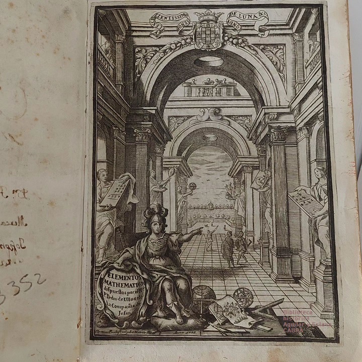 Nuestra Biblioteca conserva algunos manuales muy interesantes. Uno de ellos este 'Elementos mathematicos... 'de Pedro de Ulloa, Madrid, 1706 que fue el primer y único libro del matemático jesuita español Pedro de Ulloa (1663-1721). Es también el primer texto de Matemáticas publicado en España, donde se hablaba por primera vez, aunque brevemente, de la Geometría analítica de Descartes.