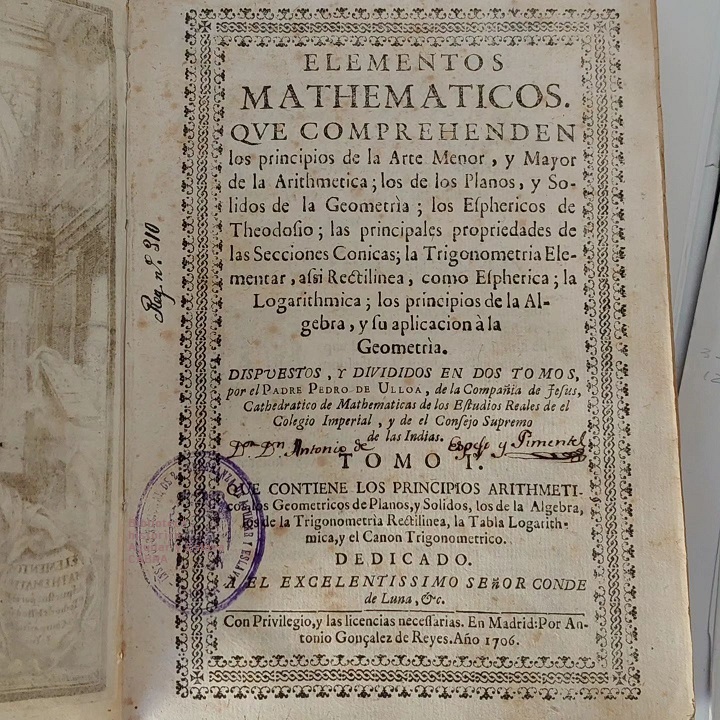 actualidad 13.05.23 LIBRO DESTACADO: El primer libro de Matemáticas publicado en España. Retomamos nuestra sección libros y documentos destacados con este ejemplar de 1706, una más de nuestras joyas bibliográficas Elementos Mathematicos de Pedro de Ulloa, Madrid, 1706. Obra considerada de un alto nivel matemático y la primera sobre las matemáticas escrita en España.