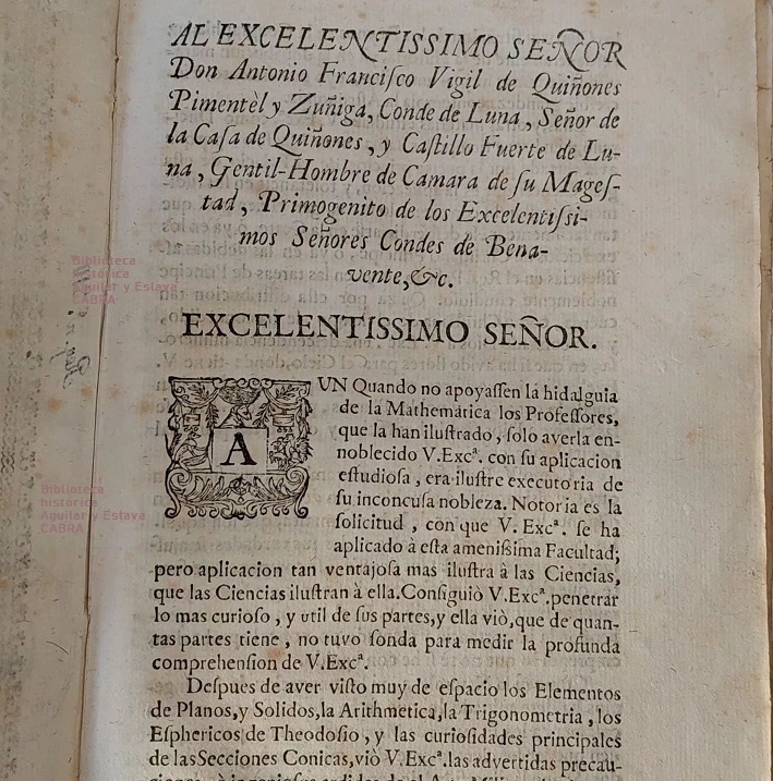 La estampa calcográfica de la portada es de Clemente Puche. Y el libro es de una auténtica belleza y de un contenido muy importante en la enseñanza de las Matemáticas en el siglo XVIII español. Fue adquirido para la 'Librería' del Colegio de la Purísima de Cabra en 1756 al Mercader de Libros de Madrid, Francisco Guerrero.