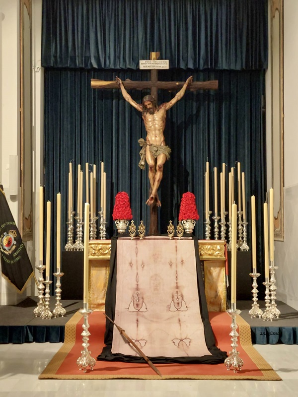 En el altar instalado, con la colaboración de la Real Hermandad de la Oración en el Huerto y la Cofradía Escolapia del Buen Fin, junto a los miembros del consejo asesor de la fundación, se presenta también una réplica a tamaño natural de la Sábana Santa de Turín, junto con algunas de las “arma Christi” o elementos de la Pasión que normalmente también pueden verse en el Museo de la Pasión de Cabra.
