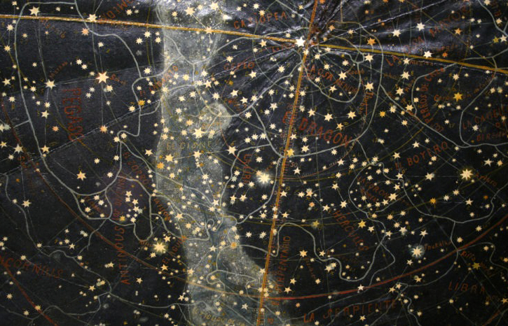 En el borde exterior del planisferio aparecen marcados los meses y la ascensión recta. En el interior aparecen varias líneas: el Ecuador celeste, la eclíptica, la línea de horizonte, la línea de los solsticios y la de los equinoccios y también el círculo de precesión, es decir, el movimiento descrito por el polo celeste en el transcurso de los siglos.